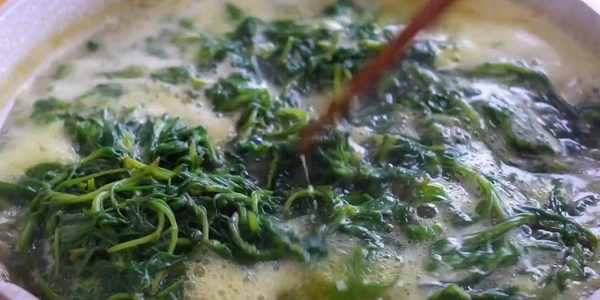 2.起鍋燒水,水開下入清明菜,加一點小蘇打或者堿面,可以很好保持顏色。焯燙兩分鐘即可。