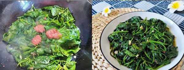 ③接著在紅薯葉中,放入一點剁碎的肉醬,再放點食鹽、味精調味,繼續炒半分鐘起鍋。