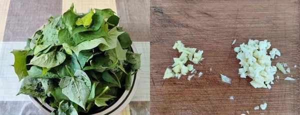 ①先準備一把紅薯葉,洗幹凈備用。另外準備一些蒜末。