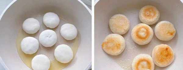 ③接著熱鍋,刷一層油防止粘鍋,放入做好的糯米餅,用小火煎到一面焦黃色,再反面繼續煎,總共煎5/6分鐘即可。在煎餅的過程中,大傢可以放多一些油水,要不斷的挪動好、糯米餅,避免粘鍋黏在一起。