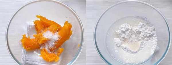 ①準備1個大的紅薯,將它去皮蒸熟,碾碎成紅薯泥,作為餡料使用。接著準備一碗糯米粉,加入適量清水,或者牛奶攪拌。