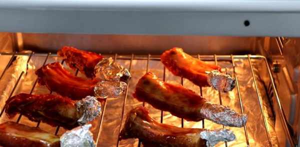 6、烤箱180度預熱,肋排放入烤盤中,預熱結束放入烤箱,180度烤35分鐘;烤到20分鐘時,可以取出再刷一層醃肉的汁繼續烤。肋排太適合烤著吃瞭,吃起來外酥裡嫩的。