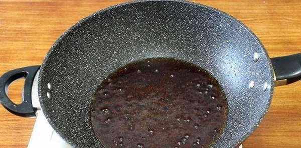 3、往鍋中倒油,放入所有的冰糖,小火炒化,再炒變成焦黃色,再變成焦紅色,這個時候往鍋中倒入清水(這裡註意安全哦,可以用鍋蓋擋住,防止鍋中往外迸濺)。