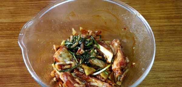 4、排骨放入大碗中,放入洋蔥、蔥、薑片,倒入一些料酒,再加入適量的生抽、蠔油、老抽和叉燒醬(可以是你認為好吃的醬)醃制一會兒。