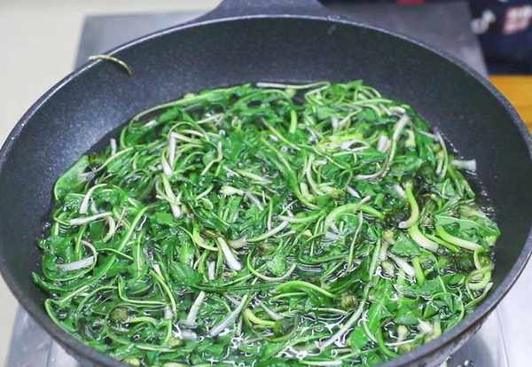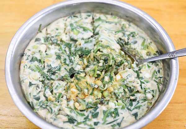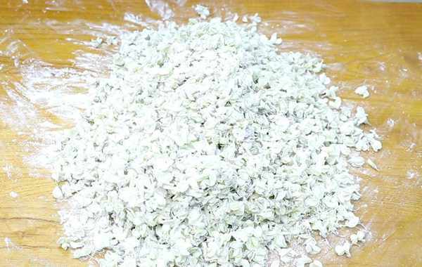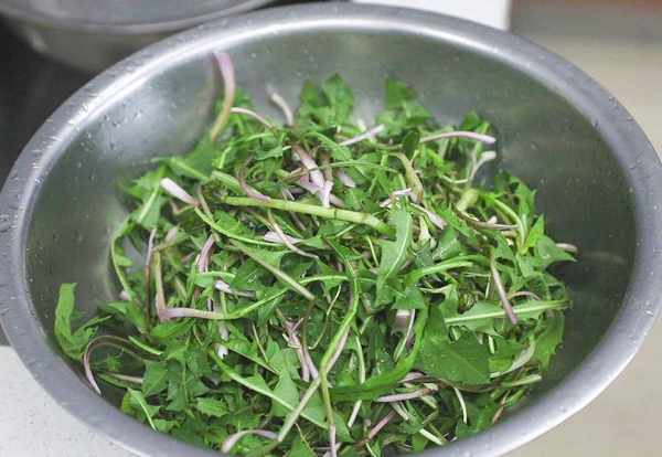 2.起鍋燒水加入食鹽和食用油,水開倒入蒲公英焯水,水開撈出沖涼擠幹水分,然後切碎備用。