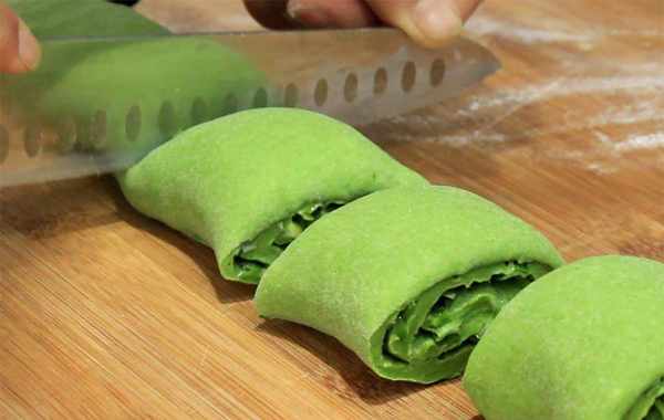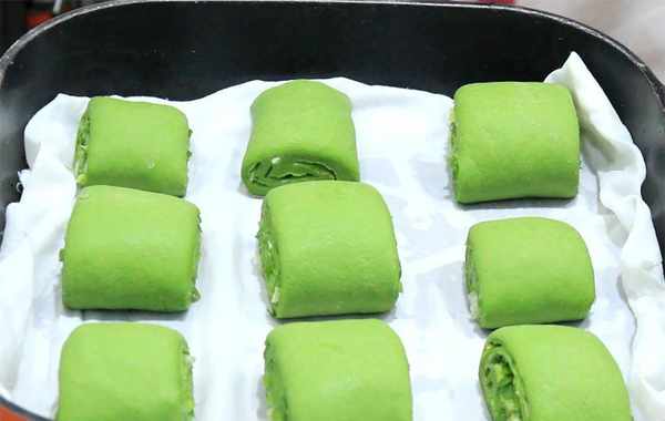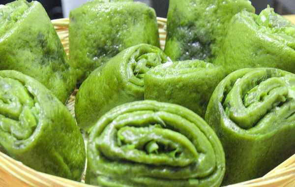 6.15分鐘以後關火,再燜2分鐘讓艾草卷慢慢冷卻,這樣艾草卷出鍋後更加暄軟,把艾草卷擺放在盤中就能食用瞭,美味即成。