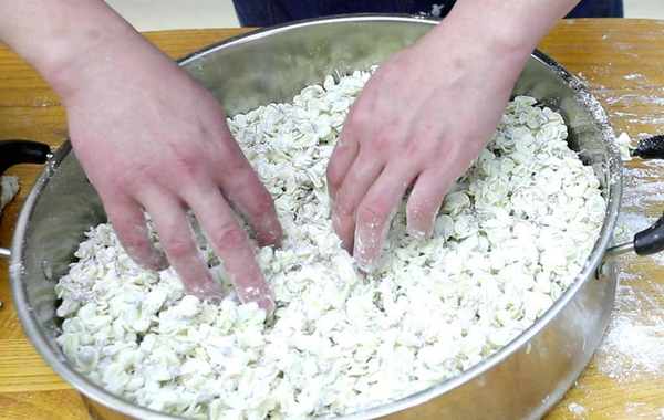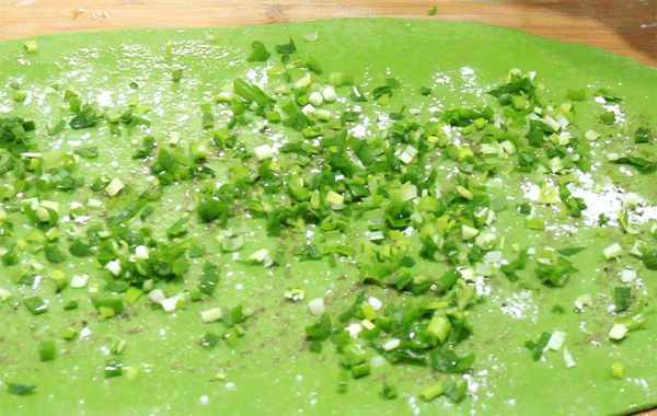 4.在面片上擠上油,用刷子刷均勻,撒一層薄薄的椒鹽再撒上面粉,放上小蔥粒,從下面往上卷,把面片卷成長條,切成大小均勻的面劑。