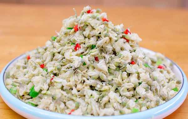 3.5分鐘以後關火,把蒸好的槐花倒出來迅速抖散,涼瞭的話容易坨在一起,再趁熱撒上食鹽、 雞粉拌勻,把槐花裝在盆中撒上蒜末、蔥花,淋上芝麻香油,再加點紅椒粒配色,顛盆拌勻就可以裝盤瞭,美味即成。