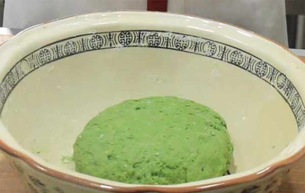 2.盆中加入面粉300克,酵母3克,用艾草泥和面,把艾草泥和面粉揉和均勻,揉成光滑的面團,用盤子蓋住發酵一個小時。小蔥幾根,破開後切碎備用。