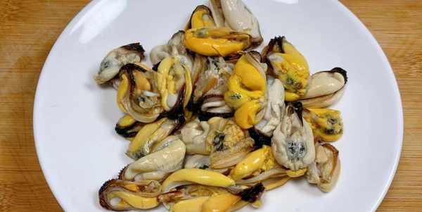 2、把晾涼後的海虹把外殼剝掉,再把它的內臟取出來,海虹的內臟是不可以吃的,它裡面會有很多的雜質和細菌,全部剝好後放入盤內備用。
