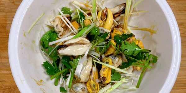 【涼拌海虹】 所準備的食材有:海虹、大蔥、香菜、蠔油、香油