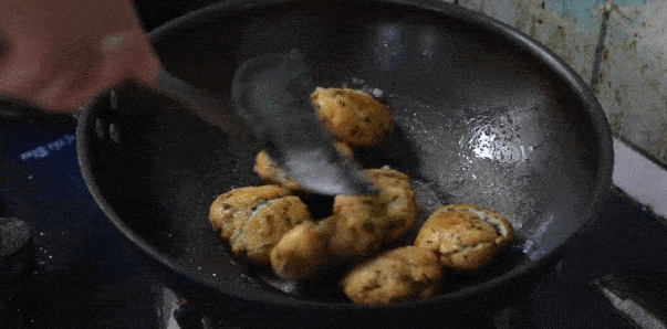 5.放入油鍋裡煎,不間斷翻面,待表面微黃後撈出