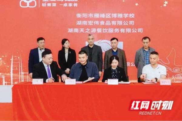 儀式現場舉行瞭戰略合作簽署儀式,湖南金旋食品供應鏈有限公司與衡陽博超建材有限公司、湘潭博雅建材有限公司、河北千喜鶴飲食股份有限公司、衡陽市雁峰區博雅學校、湖南宏偉食品有限公司、湖南矢之源餐飲服務有限公司等6傢單位達成戰略合作夥伴關系,共同推進預制菜發展。