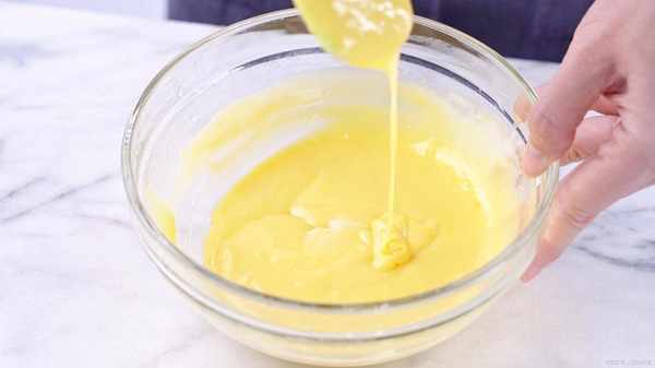 4、將蛋黃液分次加入到打發的淡奶油中,加一次,用刮刀拌勻一次,直到全部混合均勻。