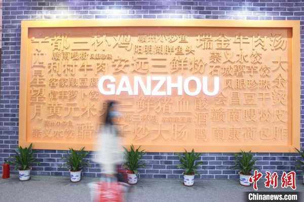 圖為第五屆贛菜美食文化節展區現場,市民從一面寫有贛州特色美食名稱的展示墻前走過。 劉力鑫 攝
