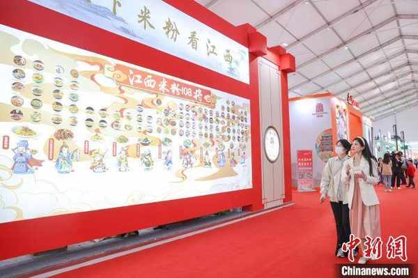 圖為第五屆贛菜美食文化節展區內,民眾從一面介紹江西米粉的展示墻前走過。 劉力鑫 攝