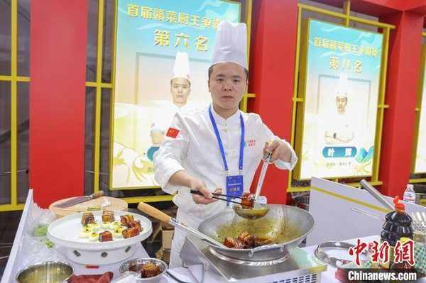 圖為第五屆贛菜美食文化節展區內,一位贛菜大廚展示自己制作的《酒香紅燒肉配糖心蛋》。 劉力鑫 攝
