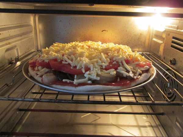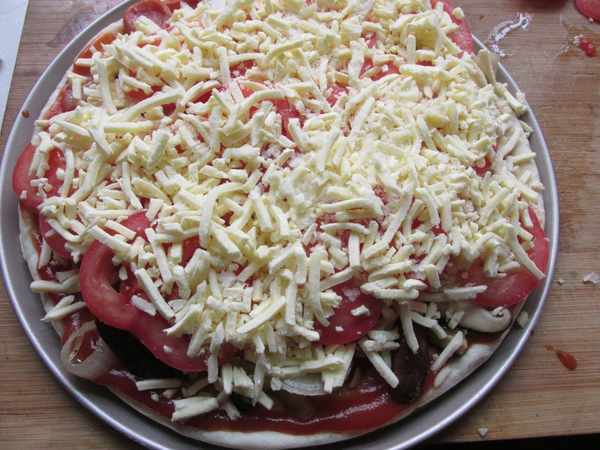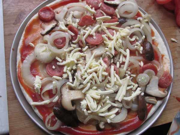 餡料:牛肉小香腸,洋葱,香菇,蕃茄,黑胡椒粉,橄欖油,鹽,番茄沙司,馬利蘇拉起司。