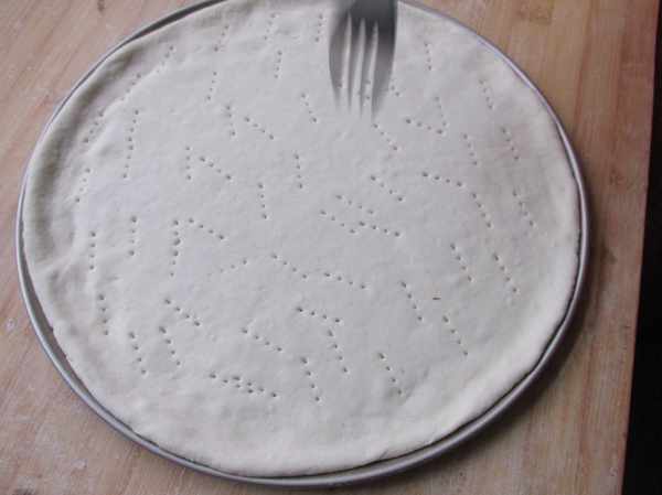 第一步:提前晚上就把麵團和好,早上拿出來擀一下,撲到披薩盤裏,用叉子紮上眼,防止批薩皮在烤制的時候鼓起來。麵團:麵粉350克,雞蛋1個,牛奶180克,鹽少許,酵母粉3克一起和勻成麵團,放置到早上就發酵成蜂窩狀了。如果想要更省勁不用和麵,那麼手抓餅坯子也是很不錯的選擇。當然,我們為了孩子吃得更健康還是提前準備麵團更好。