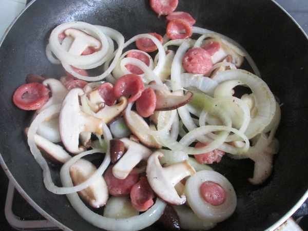 第三步:鍋裏放入橄欖油,放入洋葱,香菇,牛肉腸煎熟,撒上黑胡椒和鹽調味。