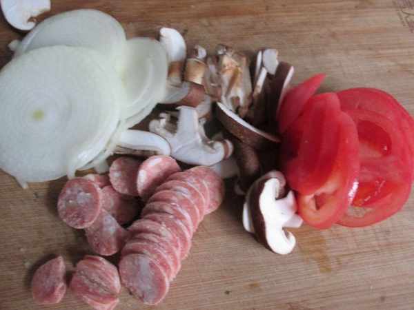 第二步:把洋葱切絲,香腸,香菇和蕃茄全部切成片備用。