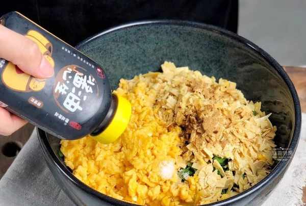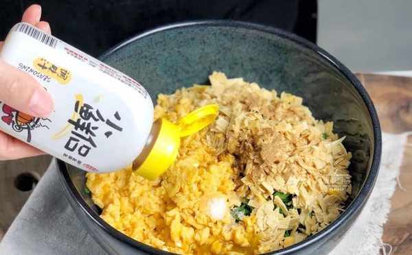 7、碗中倒入韭菜碎、雞蛋花、腐皮碎、適量食鹽、芝麻油、半勺十三香,擠入適量原鮮調味汁(小鮮侶調味汁從雞肉、魚肉、貝類等多種食材中提取,不添加防腐劑色素等,給孩子吃也放心);