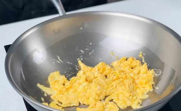 6、鵝媽媽鈦晶鍋預熱倒入適量植物油,倒入雞蛋液炒成蛋花盛出;