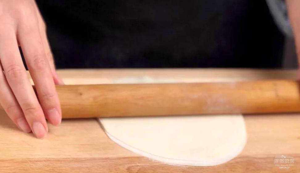 9、取幾張餃子皮,堆疊在一起搟開搟薄;