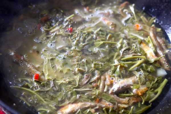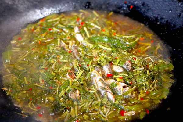 所需食材:香椿1大把、河魚幹、植物油、鹽、薑片、蒜片、小米辣、醬油