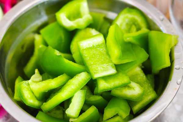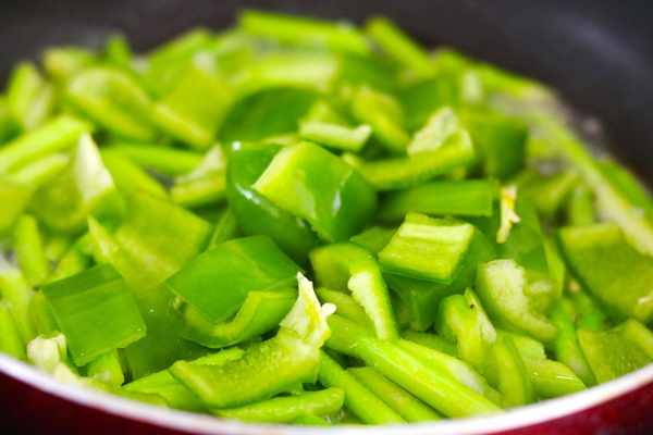 2、鍋中放入植物油,燒熱之後,放入青菜椒不斷的進行翻炒,放入少許的蒜末,來點鹽炒香。