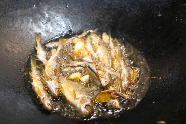 2、鍋中放入植物油,燒熱之後,放入河魚幹,這個魚需要提前浸泡一下,接著放入薑片還有蒜片。