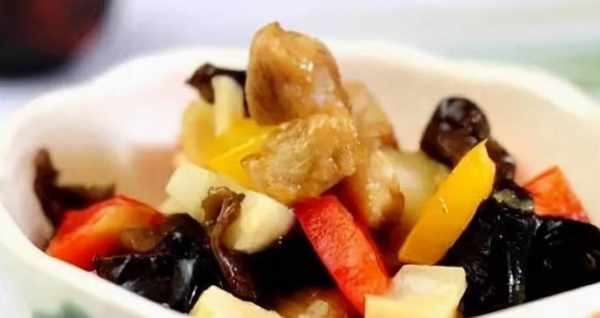 10、加入木耳、紅黃柿子椒丁,快速翻炒。