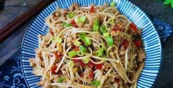 食材:金針菇300克,剁椒2勺,肉餡100克,醬油2勺,鹽1克