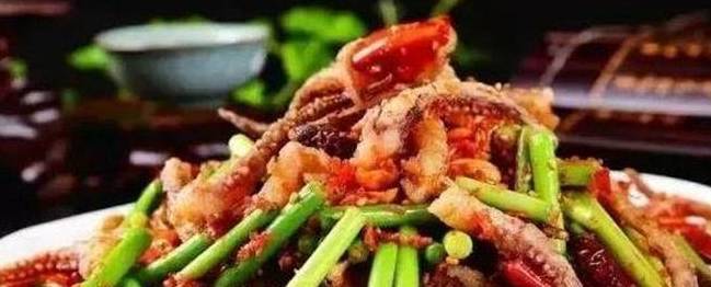 3、另起鍋,加油燒熱,下花椒、幹辣椒絲、蒜片以及適量的料酒、鹽爆香後,將芹菜和炸至六七成熟的魷魚一並下鍋翻炒;待芹菜脫生後即可關火,同時加入孜然粒、香酥椒、味精攪拌均勻即可。