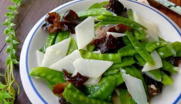 材料:荷蘭豆250克、山藥250克、木耳適量、油鹽適量、大蒜2瓣、雞精1茶匙、水淀粉適量