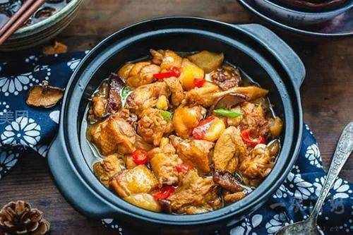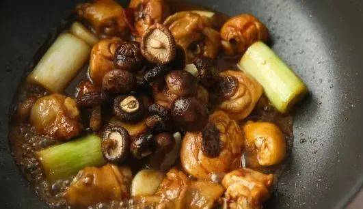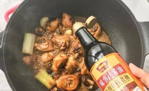 加入生抽、老抽翻炒均勻,讓雞肉變得更紅亮有食欲,再加入一小勺鹽調味,之後加入沒過食材的熱水,用中火燉煮。