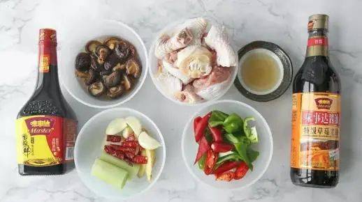 準備好所有的食材,雞腿剁成塊狀,青椒紅椒切菱形塊備用,大蒜用刀拍一下,更容易釋放香味,幹香菇用水沖洗幹凈,然後加一小碗水泡發,雞腿切好後先用料酒醃制十五分鐘備用。