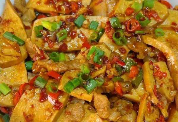 4、大概翻炒一分鐘,炒香後加入食鹽調味,快速翻炒均勻入味。再放入香幹翻炒均勻,加入醬油和蠔油調味,再放入泡椒和適量清水,蓋上蓋子燜煮2分鐘。