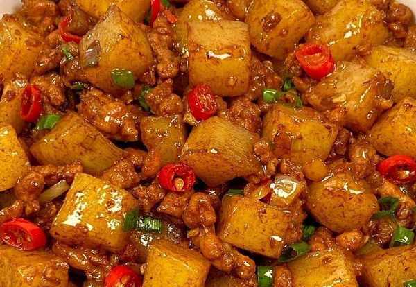 1、土豆去皮洗凈後切成丁,清水清洗掉淀粉瀝幹水分備用。豬肉清洗幹凈剁成末。