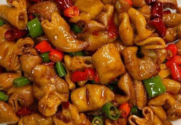 準備食材:豬大腸,洋蔥絲,薑片,蔥段,小米辣,青線椒,幹辣椒,花椒,蒜片。