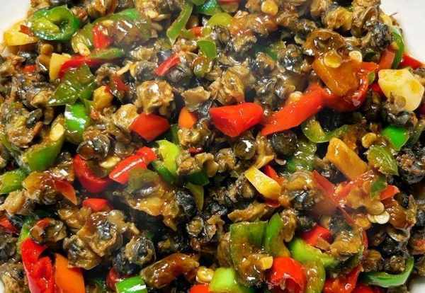 準備食材:螺螄肉,小米辣,青線椒,薑絲,蒜末。