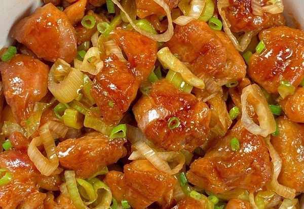3、起鍋燒油,油熱後放入醃制好的雞腿,煎至兩面金黃,就可以倒入醬汁翻炒一會兒,炒入味後,倒入提前切好的大蔥,蓋上蓋子燜煮一分鐘。