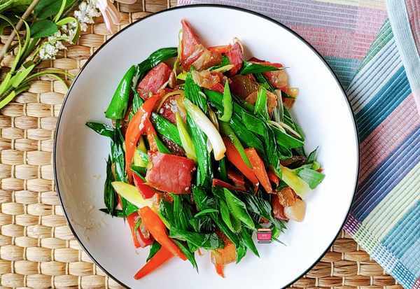 3、 鍋中燒熱油,放入幹辣椒炒出香味,之後把臘肉倒入鍋中,充分炒出油脂的香味。