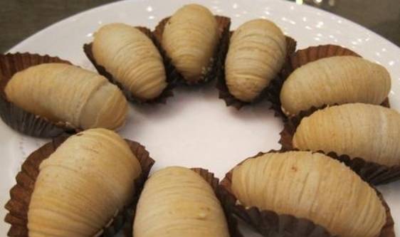 開始烤蘿卜絲餅,刷一層豬油,放入餅胚子,一般是20分鐘一鍋,一定要用小火烤,烤至金黃色的時候翻身,再烤另外一面,全部烤熟,就可以出鍋瞭。很多人傢裡沒有烤箱或者是專門的烤爐,可以用電餅鐺烙也可以,都很好吃。