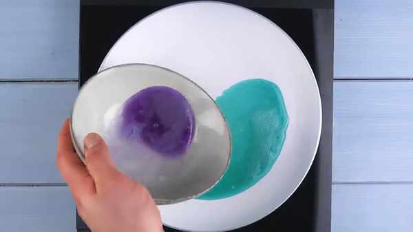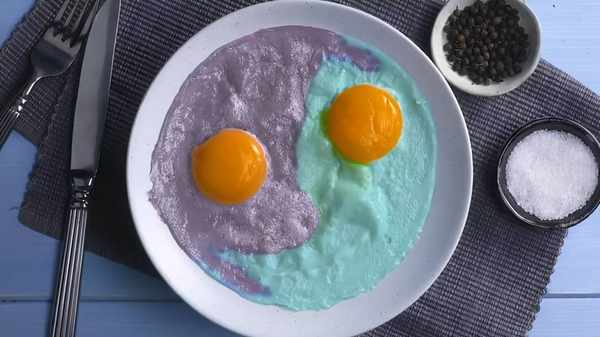 步驟、打一個雞蛋蛋清和蛋黃分開來放,紫甘藍汁分別倒入兩個裝有蛋清的碗中,一個放有檸檬汁,一個不放再用勺子攪拌均勻,把煎鍋燒熱加入適量的油,鍋燒熱瞭之後轉中火先倒入沒有加檸檬的蛋白之後再倒入另外一碗,放的時候就按照太極圖一樣的倒進鍋裡,蛋白倒完瞭之後就把蛋黃加入直到雞蛋熟透就可以瞭。