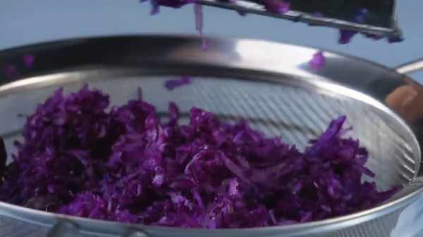 步驟、紫甘藍洗幹凈之後切成絲,放到篩子上用力壓出汁壓到碗中備用;