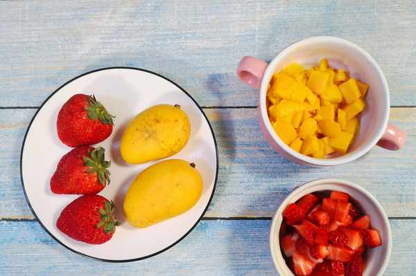 1、小臺芒去皮切小丁,草莓洗凈切丁。稱重準備好所有材料。