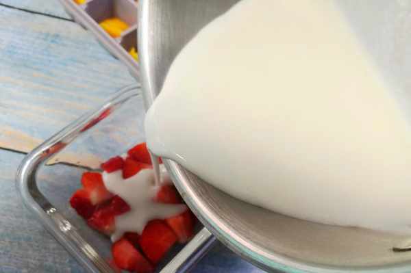 6、將煮沸的牛奶倒入模具和保鮮盒中,室溫冷卻1小時,自然定型後即可脫模食用。