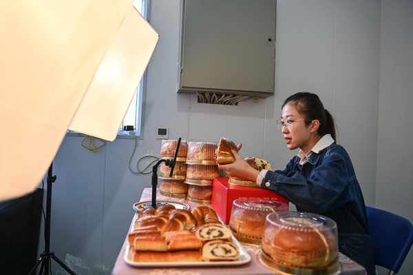 4月1日,在塔城市疆趣食品坊,員工薛怡凡在利用網絡直播向網友介紹“塔城奶酪包”。 新華社記者 費茂華 攝