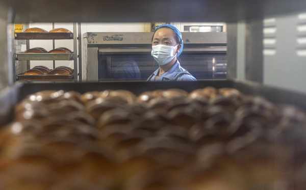 4月1日,在塔城市疆趣食品坊,員工袁月在查看“塔城奶酪包”的烘焙情況。 新華社記者 費茂華 攝